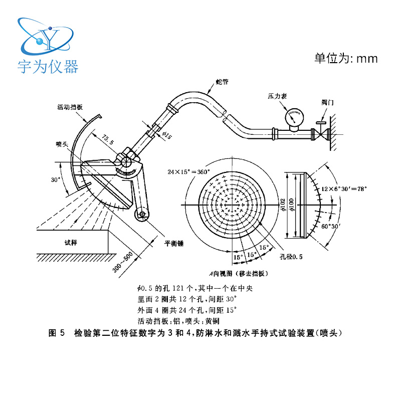 2、IPX3和IPX4的手持式防水試驗主要區別在于IPX4需卸下淋水噴頭的平衡擋板,使外殼在各個可能方向都受到濺水。