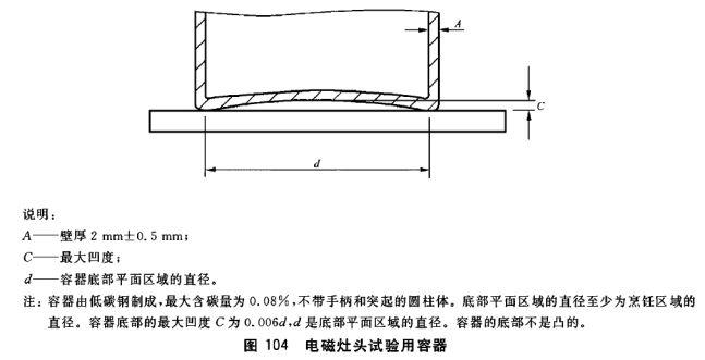 鐵鍋:由最大含碳量為0.08%低碳鋼制成,不帶手柄和突起的圓柱體,底部平面區域的直徑至少為烹飪區域的直徑。