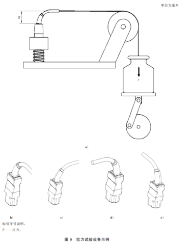 2、沿四個方向、按步驟以(90士5)°向連接器/插頭連接器電纜施加與插合面平行的表13 所示的橫向拉力,如圖9 b)~圖9e)所示。